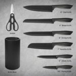🌟This 8-piece kitchen knife set is perfect for chefs. It includes a 8 chef’s knife. 7 Santoku knife. 8 serrated bread knife. 5 utility knife. 3.5 paring knife. and a kitchen shear. All tools come with a universal knife block. Ideal for high-frequency use or long periods of inactivity. ensuring the longevity of your knives.